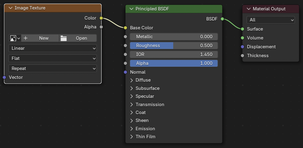 Vozlišča povezuješ z “vrvicami” – vlečeš iz izhodov (output) v vhode (input). Pazi na barve: - Sivi priključki = enodimenzionalna vrednost (npr. Roughness, Metallic) - Rumeni = barvni vektor (RGB), npr. Base Color, Emission - Modri = normalni vektorji (Normal Map, Tangent)